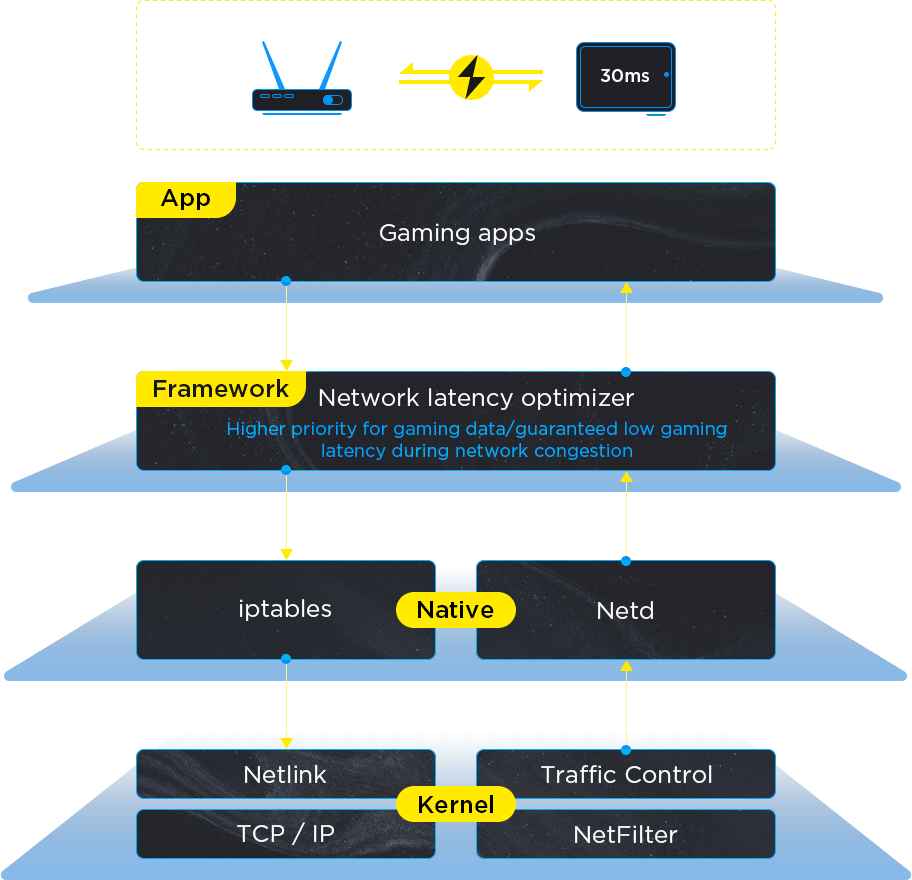 A built-in mechanism for real-time data link quality detection and evaluation dynamically allocates more network resources to gaming apps when network congestion is detected to ensure a smooth gaming experience.