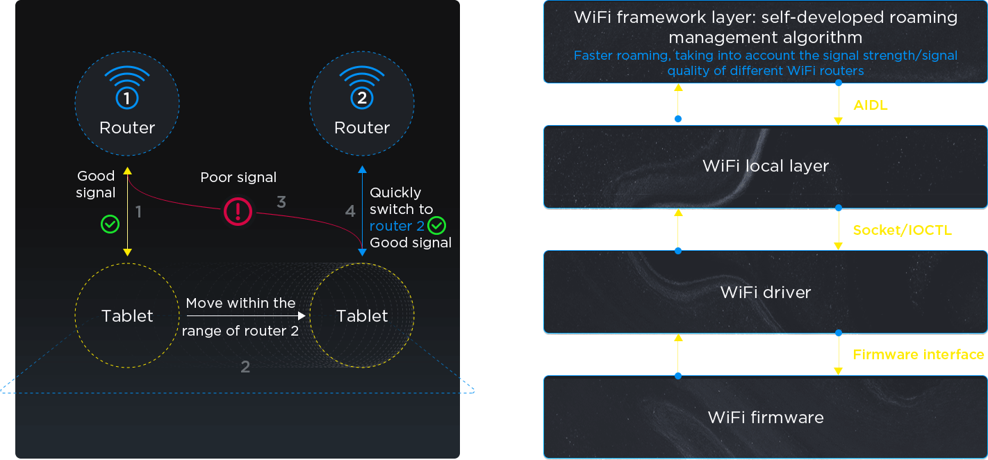 Using a self-developed algorithm, the WiFi roaming threshold is dynamically adjusted in real time to provide users with a smooth and uninterrupted network experience in ESS network environments (multiple routers using the same SSID).