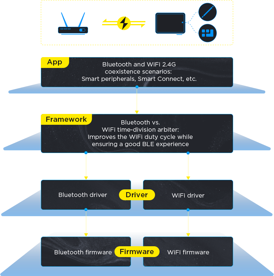 When BLE and WiFi 2.4G operate simultaneously, an optimized solution manages resource conflicts, improving WiFi data throughput while maintaining low power consumption and low latency for Bluetooth devices such as pens, keyboards, and controllers.